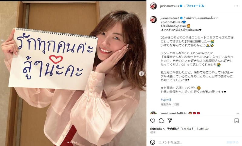 活動休止中の松井珠理奈、タイでCGM48初単独コンサートを鑑賞 5カ月ぶりの更新では倖田來未との2ショットも 2023.08.08 Published by Real Sound 2022年4月から体調不良で活動を休止中の元SKE48・松井珠理奈が、8月7日にInstagramを… もっと読む