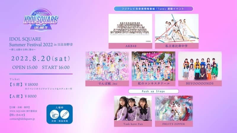 フジテレビ『Tune』連動イベント開催決定! AKB48、エビ中、でんぱ組、虹コン、BEYOOOOONDS、タスク、FRUITS ZIPPER出演 2022.06.30 Published by Pop’n’Roll フジテレビ系音楽情報番組『Tune』と連動したライブイベント<IDOL SQUARE>第2弾となる<… もっと読む
